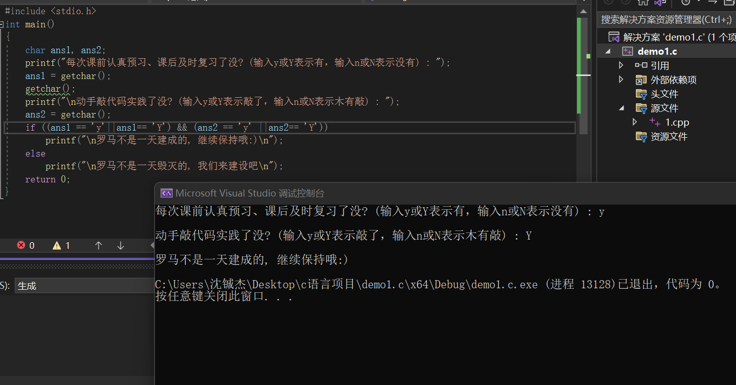 #include <stdio.h> int main() { char ans1, ans2; printf("每次课前认真预习、课后及时复习了没? (输入y或Y表示有,输入n或N表示没有) : "); ans1 = getchar(); getchar(); printf("\n动手敲代码实践了没? (输入y或Y表示敲了,输入n或N表示木有敲) : "); ans2 = getchar(); if ((ans1 == 'y'||ans1== 'Y') && (ans2 == 'y' ||ans2== 'Y')) printf("\n罗马不是一天建成的, 继续保持哦:)\n"); else printf("\n罗马不是一天毁灭的, 我们来建设吧\n"); return 0; }