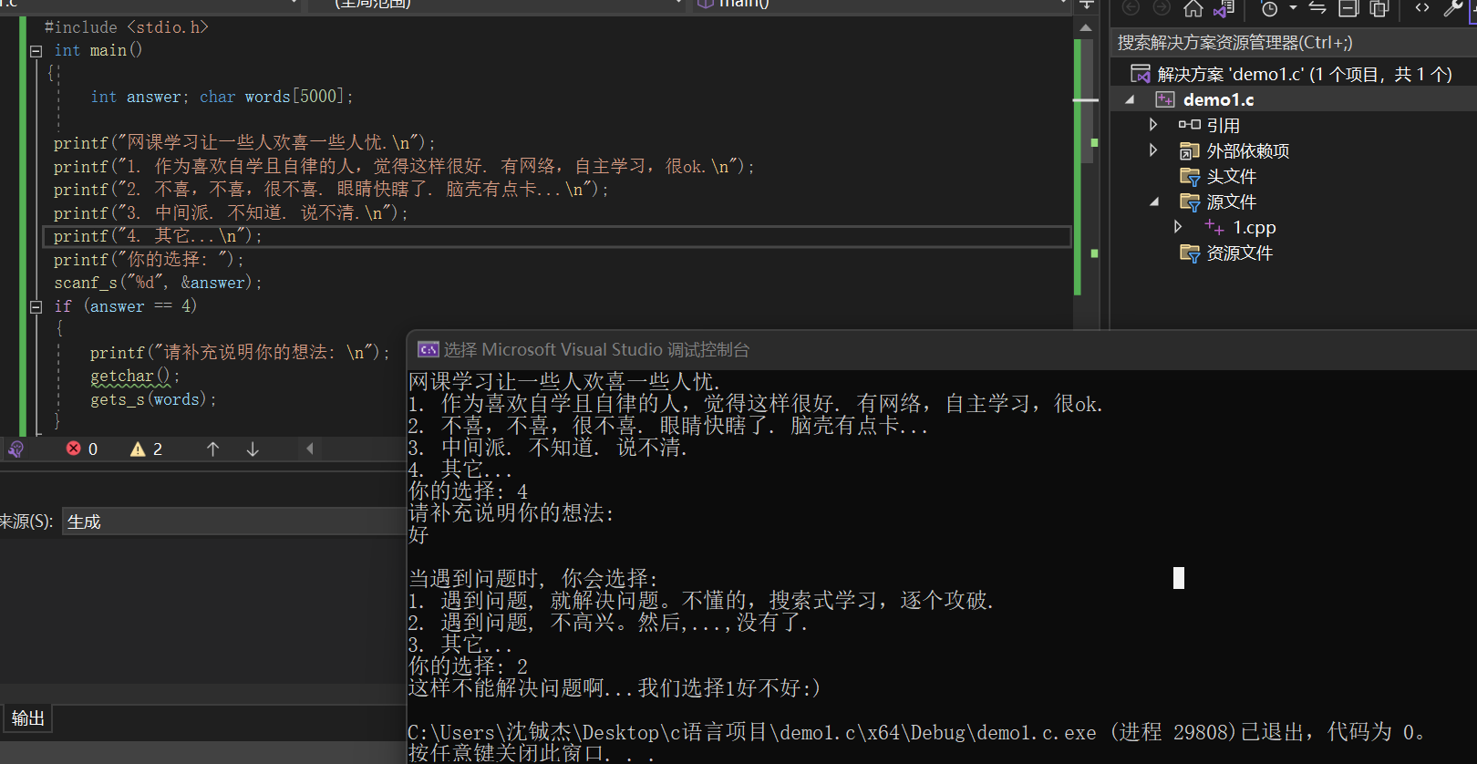 #include <stdio.h> int main() { int answer; char words[5000]; printf("网课学习让一些人欢喜一些人忧.\n"); printf("1. 作为喜欢自学且自律的人,觉得这样很好. 有网络,自主学习,很ok.\n"); printf("2. 不喜,不喜,很不喜. 眼睛快瞎了. 脑壳有点卡...\n"); printf("3. 中间派. 不知道. 说不清.\n"); printf("4. 其它...\n"); printf("你的选择: "); scanf_s("%d", &answer); if (answer == 4) { printf("请补充说明你的想法: \n"); getchar(); gets_s(words); } printf("\n"); printf("当遇到问题时, 你会选择:\n"); printf("1. 遇到问题, 就解决问题。不懂的,搜索式学习,逐个攻破.\n"); printf("2. 遇到问题, 不高兴。然后,...,没有了.\n"); printf("3. 其它...\n"); printf("你的选择: "); scanf_s("%d", &answer); if (answer == 1) printf(":)\n"); else if (answer == 2) printf("这样不能解决问题啊...我们选择1好不好:)\n"); else if (answer == 3) { printf("请补充说明你的想法: \n"); getchar(); gets_s(words); } return 0; }