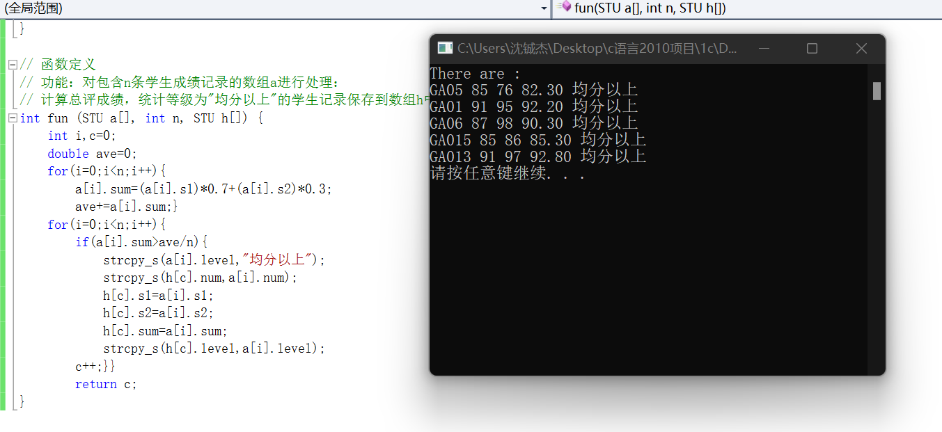 #include <stdio.h> #include<string.h> #include<stdlib.h> #define N 100 typedef struct { char num[10]; // 学号 int s1; // 期末成绩 int s2; // 平时成绩 double sum; // 总评 char level[10]; // 等级 } STU; int fun(STU a[], int n, STU h[]); // 函数声明 int main() { STU s[N]={ {"GA05", 85, 76}, {"GA03", 76, 90}, {"GA02", 69, 90}, {"GA04", 85, 56}, {"GA01", 91, 95}, {"GA07", 72, 80}, {"GA08", 64, 45}, {"GA06", 87, 98}, {"GA015", 85, 86}, {"GA013", 91, 97} }; // 原始学生成绩记录 STU h[N]; // 保存均分以上学生记录 int i, k, n = 10; // 调用fun对学生成绩记录进行处理 k = fun(s, n, h); // 输出均分以上学生记录 printf("There are :\n"); for(i = 0; i < k; i++) printf("%s %d %d %.2f %s\n", h[i].num, h[i].s1, h[i].s2, h[i].sum, h[i].level); system("pause"); return 0; } // 函数定义 // 功能:对包含n条学生成绩记录的数组a进行处理: // 计算总评成绩,统计等级为"均分以上"的学生记录保存到数组h中,并返回其人数 int fun (STU a[], int n, STU h[]) { int i,c=0; double ave=0; for(i=0;i<n;i++){ a[i].sum=(a[i].s1)*0.7+(a[i].s2)*0.3; ave+=a[i].sum;} for(i=0;i<n;i++){ if(a[i].sum>ave/n){ strcpy_s(a[i].level,"均分以上"); strcpy_s(h[c].num,a[i].num); h[c].s1=a[i].s1; h[c].s2=a[i].s2; h[c].sum=a[i].sum; strcpy_s(h[c].level,a[i].level); c++;}} return c; }
