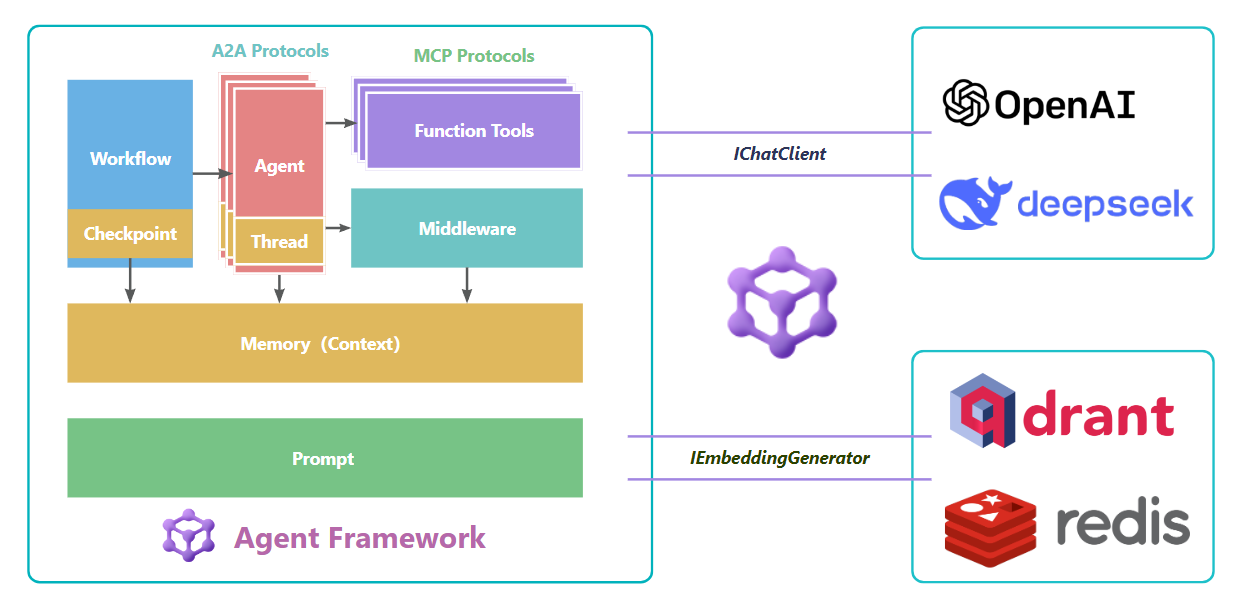 这意味着什么? .NET开发者可以用熟悉的依赖注入、中间件模式开发AI应用,不再需要学习Python那套完全不同的开发范式。
