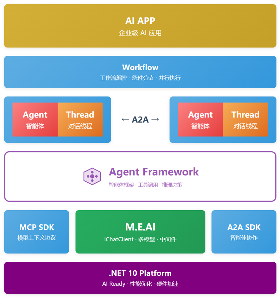 | 🤖 智能体层 | MAF | 单智能体核心 | 自主决策、工具调用 |