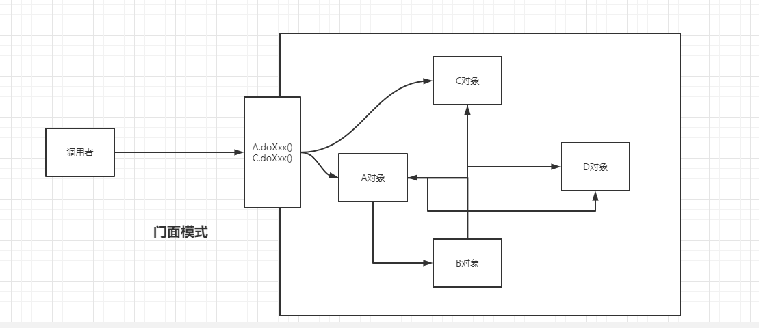 调用者对象想调用A对象的doXXX()时,可能需要先调用B对像的doXxx(),其实调用者只想做一件事情,但是犹豫实际业务的复杂性,它需要持有很多对象的应用,此时就可以创建一个门面对象,将这种多对象调用封装到