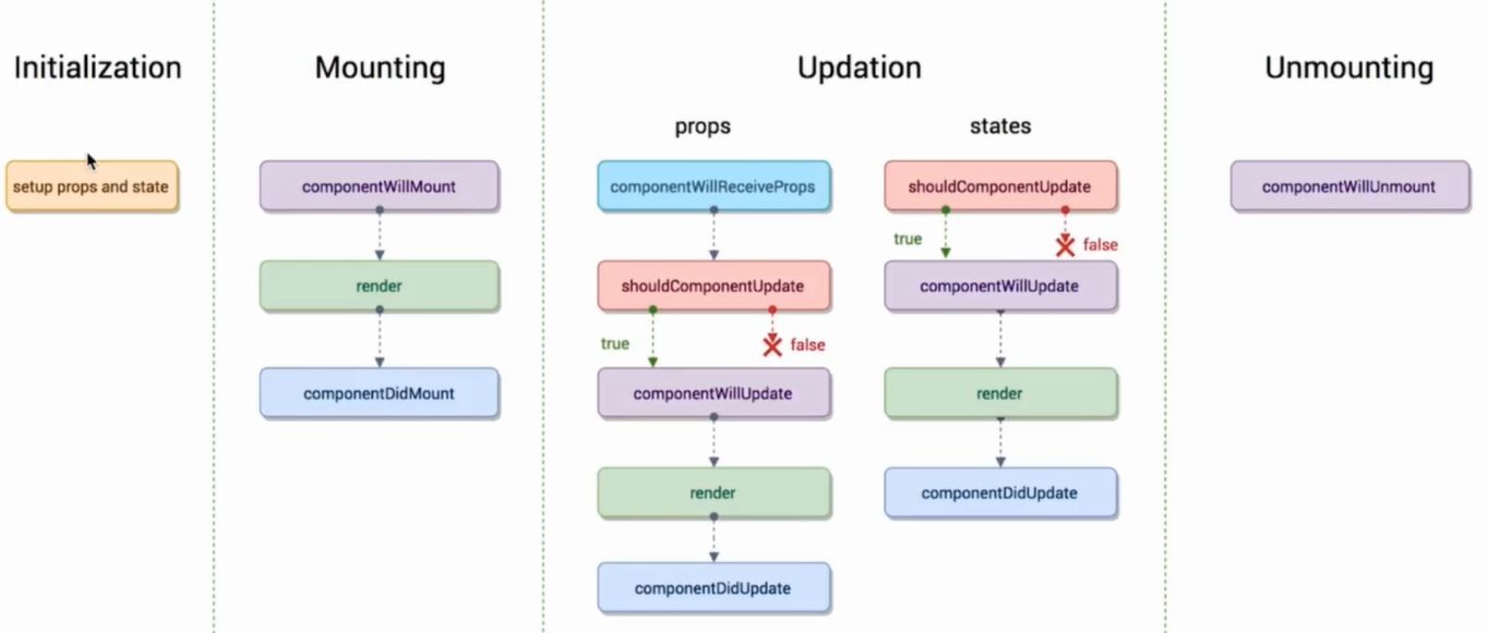 对于子组件来说,props是父组件给子组件传递的属性,每当父组件调用了render方法渲染一次,子组件的componentWillReceiveProps函数就会执行一次,但是第一次父组件render的时候例外,很好理解,因为这是Updation过程,而第一次渲染出来并不是更新过程。同样componentWillReceiveProps执行结束,接着执行shouldComponentUpdate->componentWillUpdate->render->componentDidUpdate