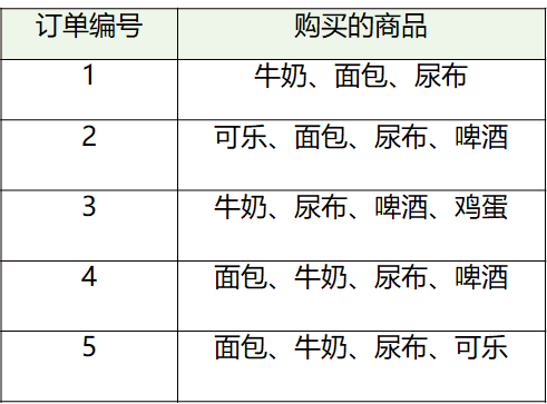 我们把上面案例中的商品用ID来代表,牛奶、面包、尿布、可乐、啤酒、鸡蛋的商品ID分别设置为1-6