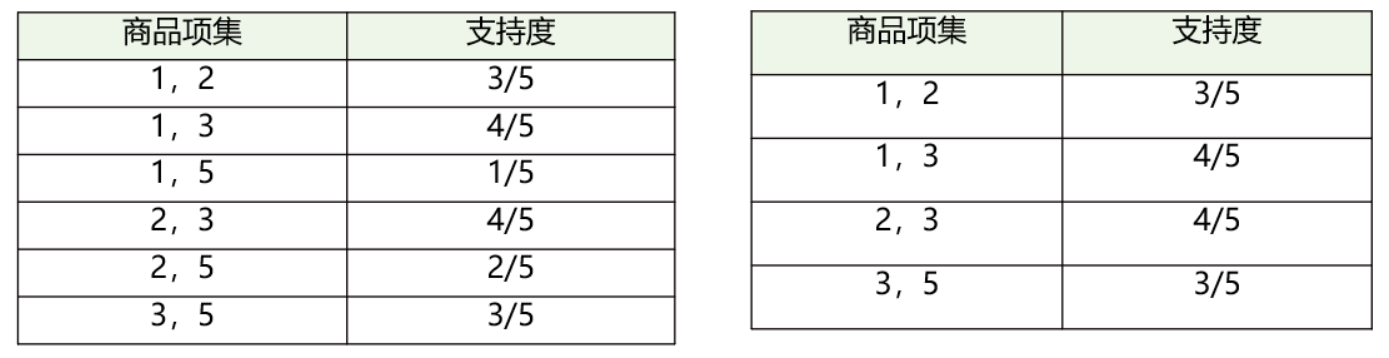 在这个基础上,我们将商品两两组合,得到K=2项的支持度;