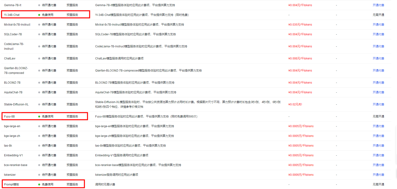 目前千帆有3个免费的大模型,想白嫖的可以试用一下,若想要有好的性能和模型效果,需要开通付费。注意 Prompt模板、Fuyu-8B 并非 AI 对话模型,我们下面使用 Yi-34B-Chat 模型调试代码。