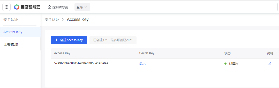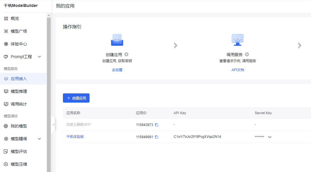 3、获取应用的 API Key 和 Secret Key(千帆官网推荐安全认证的 Access Key 和 Secret Key,这个下面会讲到)。