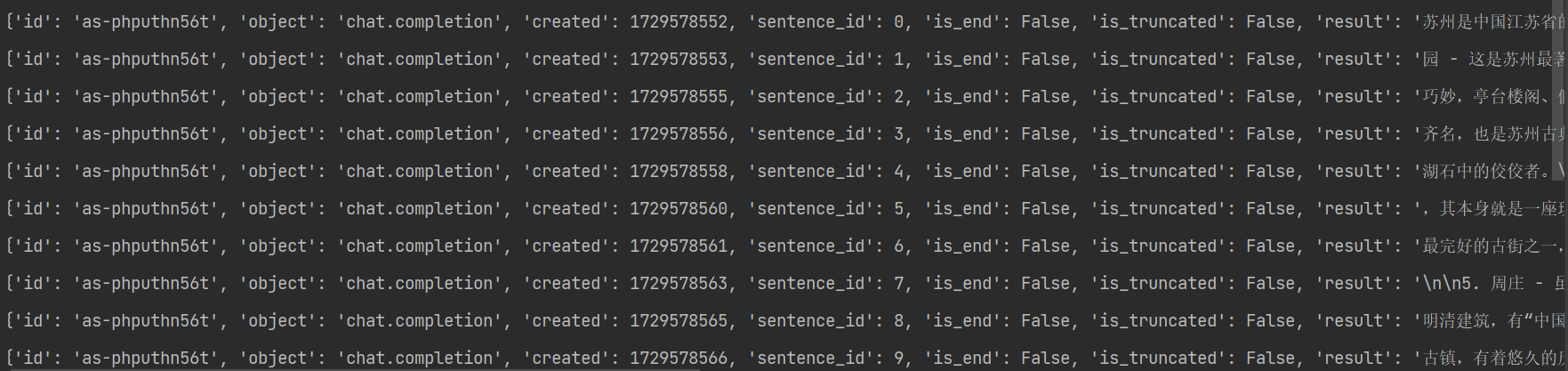 3、如果想要像文心一言一样一个字或一段文字连续的吐出来,可以使用流式输出: