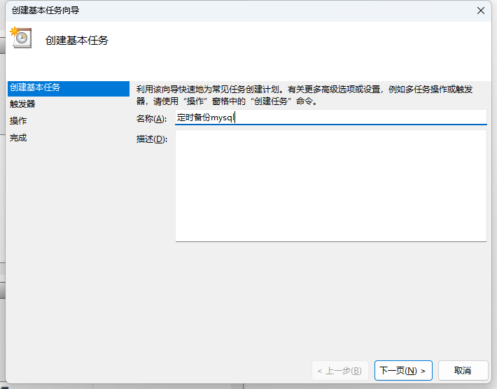 打开windows系统的“任务计划程序”,右侧创建基本任务,输入名称