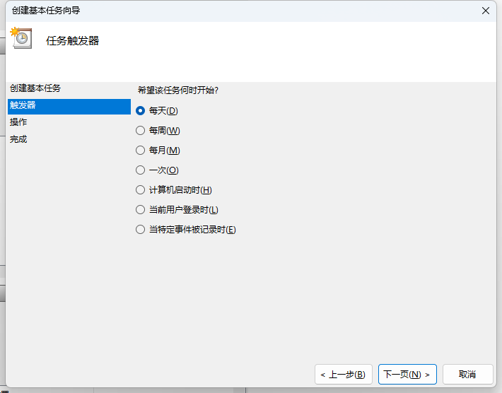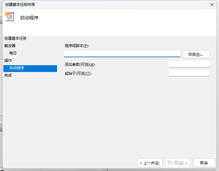 选择启动程序,确认下一步,程序或脚本选择自己创建的.bat文件,最后点击完成