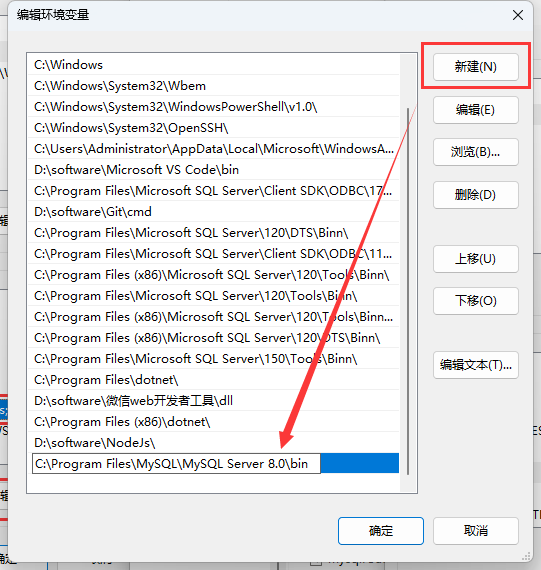 选择新建,将mysql的bin文件夹地址填入,点击确定。
