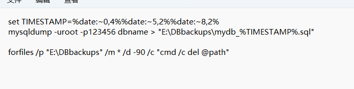 mysqldump -uroot -p123456 dbname > "E:\DBbackups\mydb_%TIMESTAMP%.sql"