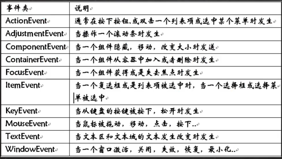 3.事件:事件就是承载事件源状态改变时的对象,比如当键盘事件,鼠标事件、窗口事件等等,会生成一个事件对象,该对象保存着当前事件很多信息,如果KeyEvent对象有含有被按下键的Code值。java.awt.event包和javax.swing.event包中定义了各种事件类型