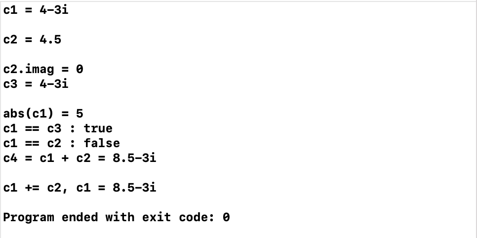 #include "Complex.hpp" #include <iostream> int main() { using namespace std; Complex c1(4, -3); const Complex c2(4.5); Complex c3(c1); cout << "c1 = "; c1.show(); cout << endl; cout << "c2 = "; c2.show(); cout << endl; cout << "c2.imag = " << c2.get_imag() << endl; cout << "c3 = "; c3.show(); cout << endl; cout << "abs(c1) = "; cout << abs(c1) << endl; cout << boolalpha; cout << "c1 == c3 : " << is_equal(c1, c3) << endl; cout << "c1 == c2 : " << is_equal(c1, c2) << endl; Complex c4; c4 = add(c1, c2); cout << "c4 = c1 + c2 = "; c4.show(); cout << endl; c1.add(c2); cout << "c1 += c2, " << "c1 = "; c1.show(); cout << endl; }