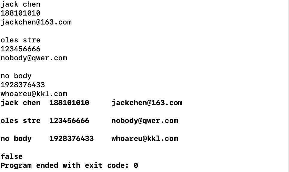 #include<iostream> #include<string> using namespace std; class Person{ public: Person(){} Person(string a,string b,string c=" "):name(a),telephone(b),email(c){} void newtel(string newtele) {telephone=newtele;} void newemail(string newe) {email=newe;} friend ostream& operator<<(ostream &out,const Person &x); friend istream& operator>>(istream &in,Person &x); friend bool operator==(const Person &a,const Person &b); private: string name; string telephone; string email; }; ostream& operator<<(ostream &out,const Person &x) { out<<setw(11)<<left<<x.name<<setw(14)<<left<<x.telephone<<x.email<<endl; return out; } istream& operator>>(istream &in,Person &x) { in>>ws; getline(cin,x.name); in>>x.telephone; in>>x.email; return in; } bool operator==(const Person &a,const Person &b) { if(a.name==b.name&&a.email==b.email&&a.telephone==b.telephone) return true; else return false; }