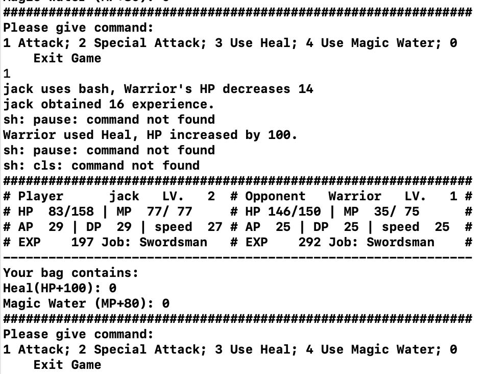 //======================= // main.cpp //======================= // main function for the RPG style game #include <iostream> #include <string> using namespace std; #include "swordsman.h" int main() { string tempName; bool success=0; //flag for storing whether operation is successful cout <<"Please input player's name: "; cin >>tempName; // get player's name from keyboard input player *human; // use pointer of base class, convenience for polymorphism int tempJob; // temp choice for job selection do { cout <<"Please choose a job: 1 Swordsman, 2 Archer, 3 Mage"<<endl; cin>>tempJob; system("cls"); // clear the screen switch(tempJob) { case 1: human=new swordsman(1,tempName); // create the character with user inputted name and job success=1; // operation succeed break; default: break; // In this case, success=0, character creation failed } }while(success!=1); // so the loop will ask user to re-create a character int tempCom; // temp command inputted by user int nOpp=0; // the Nth opponent for(int i=1;nOpp<5;i+=2) // i is opponent's level { nOpp++; system("cls"); cout<<"STAGE" <<nOpp<<endl; cout<<"Your opponent, a Level "<<i<<" Swordsman."<<endl; system("pause"); swordsman enemy(i, "Warrior"); // Initialise an opponent, level i, name "Junior" human->reFill(); // get HP/MP refill before start fight while(!human->death() && !enemy.death()) // no died { success=0; while (success!=1) { showinfo(*human,enemy); // show fighter's information cout<<"Please give command: "<<endl; cout<<"1 Attack; 2 Special Attack; 3 Use Heal; 4 Use Magic Water; 0 Exit Game"<<endl; cin>>tempCom; switch(tempCom) { case 0: cout<<"Are you sure to exit? Y/N"<<endl; char temp; cin>>temp; if(temp=='Y'||temp=='y') return 0; else break; case 1: success=human->attack(enemy); human->isLevelUp(); enemy.isDead(); break; case 2: success=human->specialatt(enemy); human->isLevelUp(); enemy.isDead(); break; case 3: success=human->useHeal(); break; case 4: success=human->useMW(); break; default: break; } } if(!enemy.death()) // If AI still alive enemy.AI(*human); else // AI died { cout<<"YOU WIN"<<endl; human->transfer(enemy); // player got all AI's items } if (human->death()) { system("cls"); cout<<endl<<setw(50)<<"GAME OVER"<<endl; human->isDead(); // player is dead, program is getting to its end, what should we do here? system("pause"); return 0; } } } delete human;// You win, program is getting to its end, what should we do here? system("cls"); cout<<"Congratulations! You defeated all opponents!!"<<endl; system("pause"); return 0; }