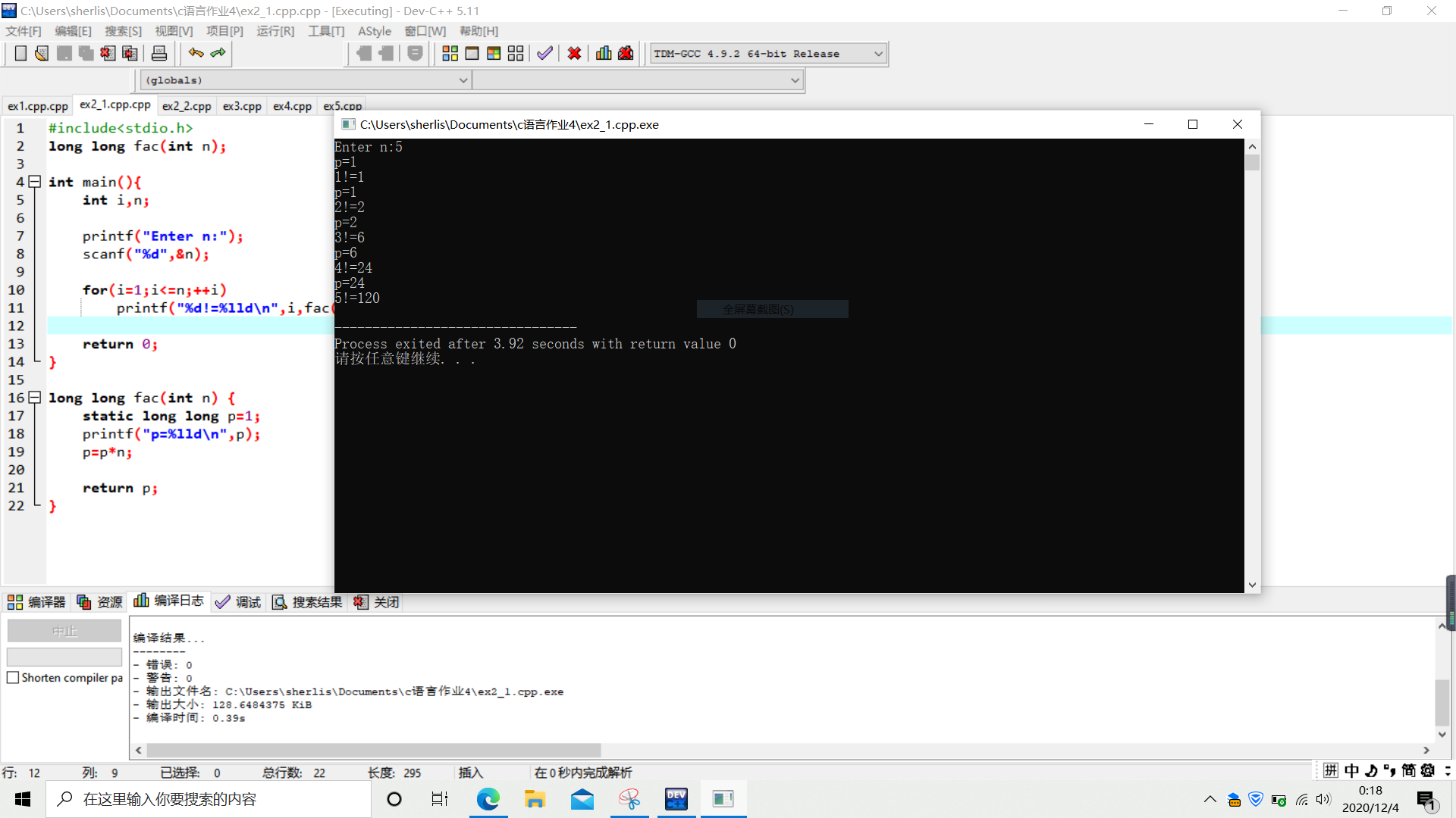 printf("%d!=%lld\n",i,fac(i));