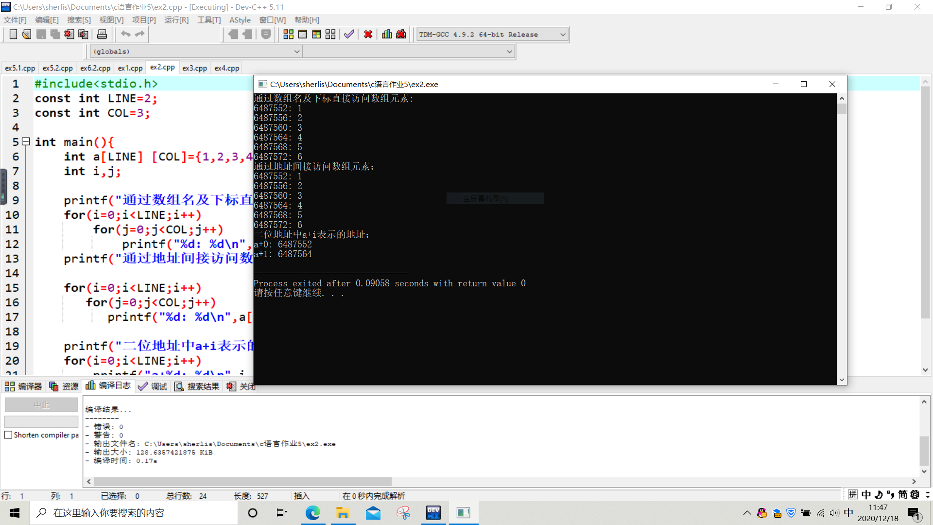printf("二位地址中a+i表示的地址:\n");