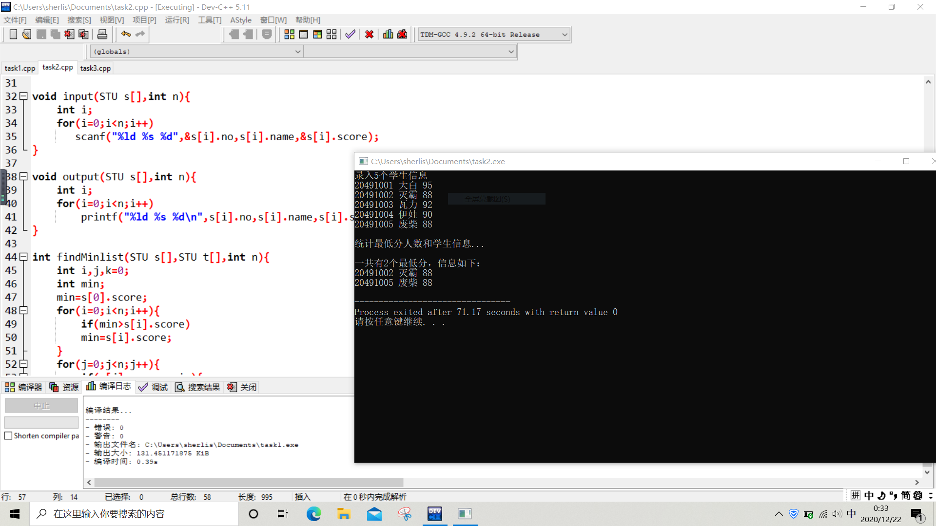 printf("\n一共有%d个最低分,信息如下:\n",count);