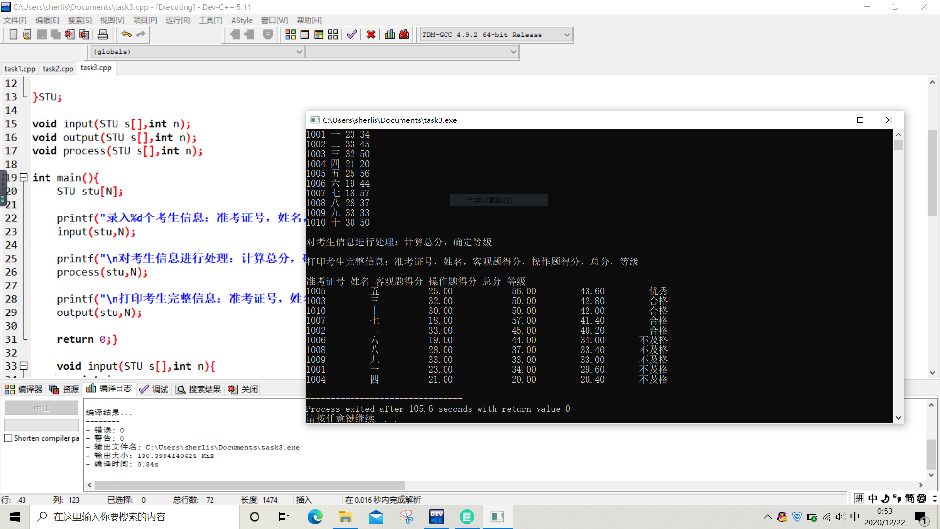 printf("\n打印考生完整信息:准考证号,姓名,客观题得分,操作题得分,总分,等级\n");