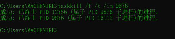 taskkill /f /t /im 9876 杀死进程 有报错以管理员身份运行cmd