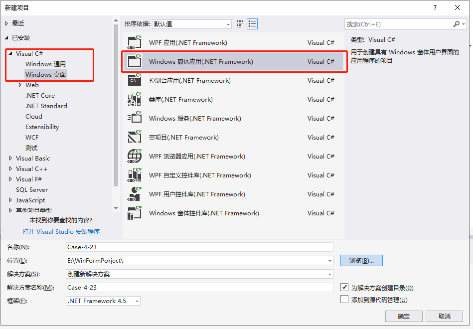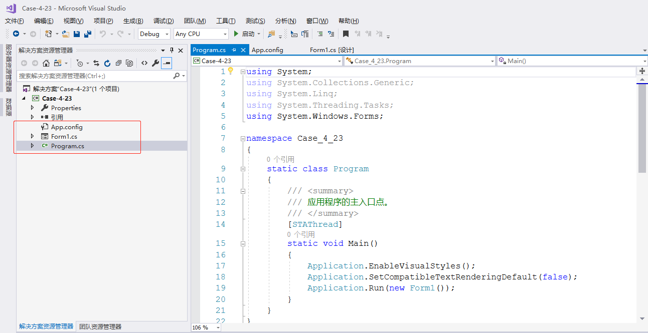 工程建立完成后,项目中包括3个文件App.config(配置文件)、Form1.cs(窗口程序)、Program.cs(程序主入口)。