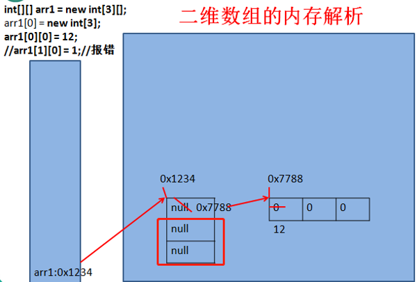 只初始化了第一维数组,二维没有初始化,所以arr3[1]是第二个一维数组的地址,因为二维没有初始化,所以为null