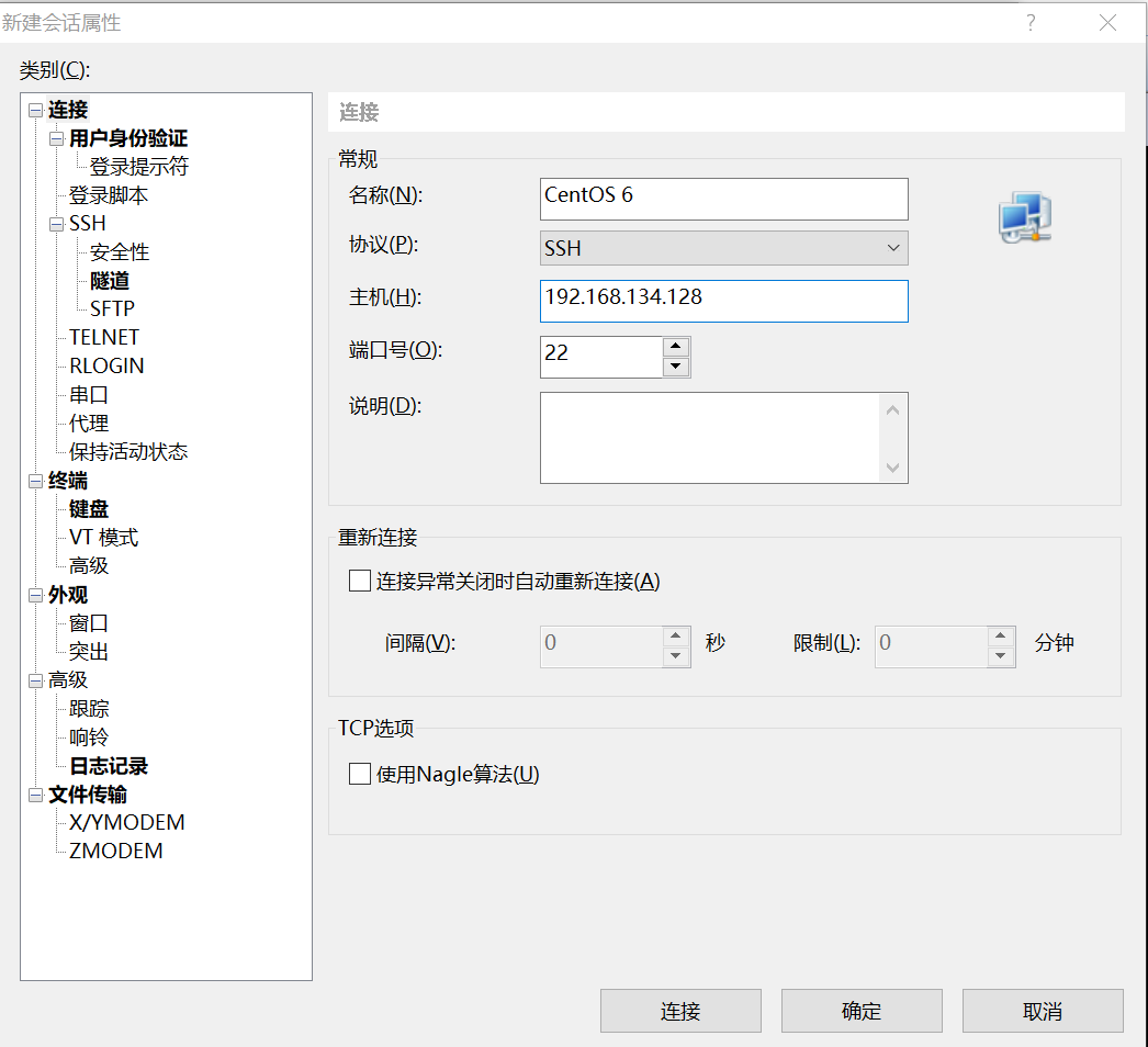打开Xshell,新建会话,协议选择SSH,主机填写LInux系统的ip,端口号22号