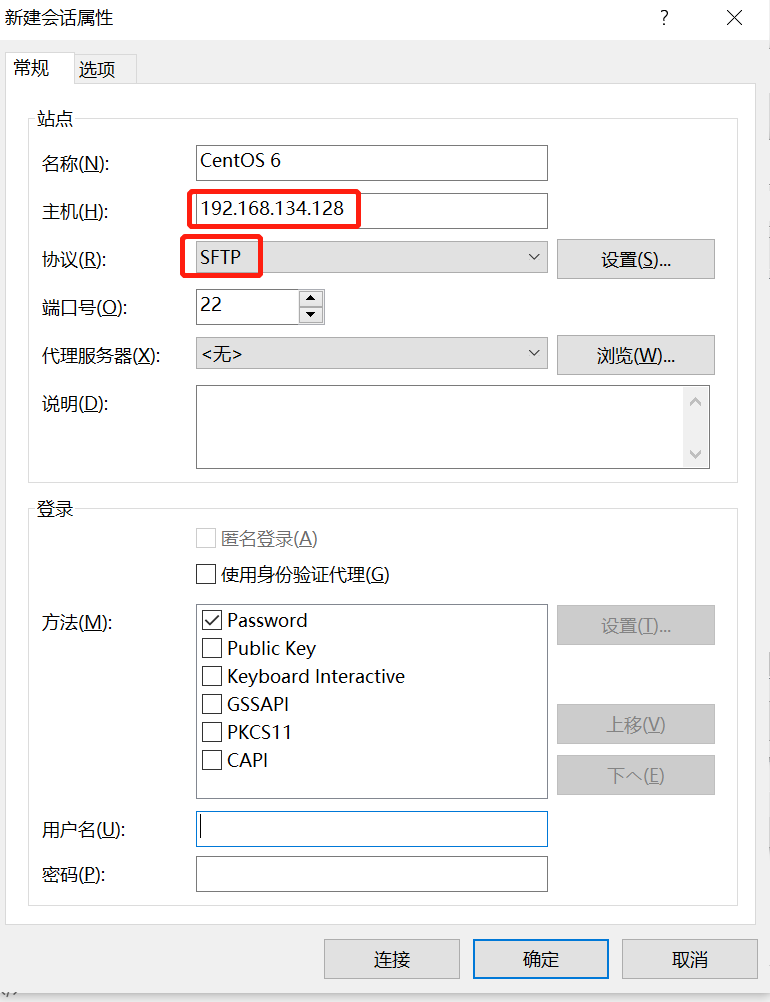 新建会话,协议选择SFTP,端口号22号;主机为Linux系统的ip;输入Linux系统用户名和密码,连接即可。