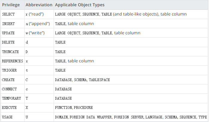 有不同种类的权限:SELECT、INSERT、UPDATE、DELETE、TRUNCATE、REFERENCES、TRIGGER、CREATE、CONNECT、TEMPORARY、EXECUTE 和 USAGE。适用于特定对象的权限因对象的类型(表、函数等)而异。