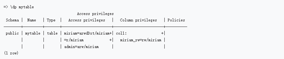 已为特定对象授予的权限显示为 aclitem 条目列表,其中每个 aclitem 描述了由特定授予者授予的一个被授予者的权限。例如,calvin=rw/hobbes 指定角色 calvin 具有权限 SELECT (r) 和授予选项 () 以及不可授予的权限 UPDATE (w),两者均由角色 hobbes 授予。如果 calvin 还对由不同授予者授予的同一对象具有某些权限,则这些权限将显示为单独的 aclitem 条目。aclitem 中的空受让人字段代表 PUBLIC。