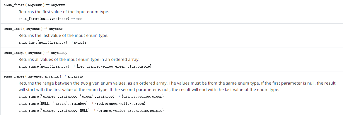 select enum_range('orange'::rainbow, NULL);