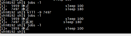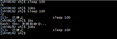在第一个sleep 100后按Ctrl+C组合键,此时进程被中断。第二个sleep 100后按Ctrl+Z组合键,进程被暂停。