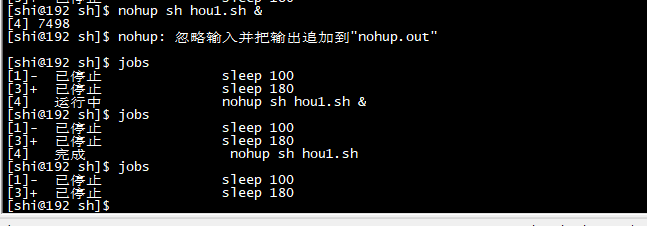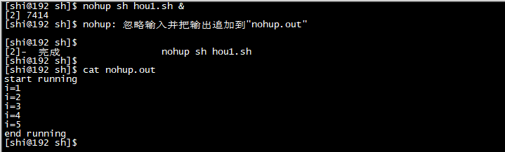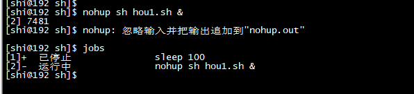 当执行后台任务时,也会将输出显示在屏幕上。运行完后会显示作业号,作业状态,启功名称。如果关闭控制台,后台任务也会取消。要想在关闭控制台后后台任务继续运行可使用nohup。nohup命令运行了另外一个命令来阻断所有发送给该进程的SIGHUP信号。这会在退出终端会话时阻止进程退出。由于nohup命令会解除终端与进程的关联,进程也就不再同STDOUT和STDERR联系在一起。为了保存该命令产生的输出,nohup命令会自动将STDOUT和STDERR的消息重定向到一个名为nohup.out的文件中。