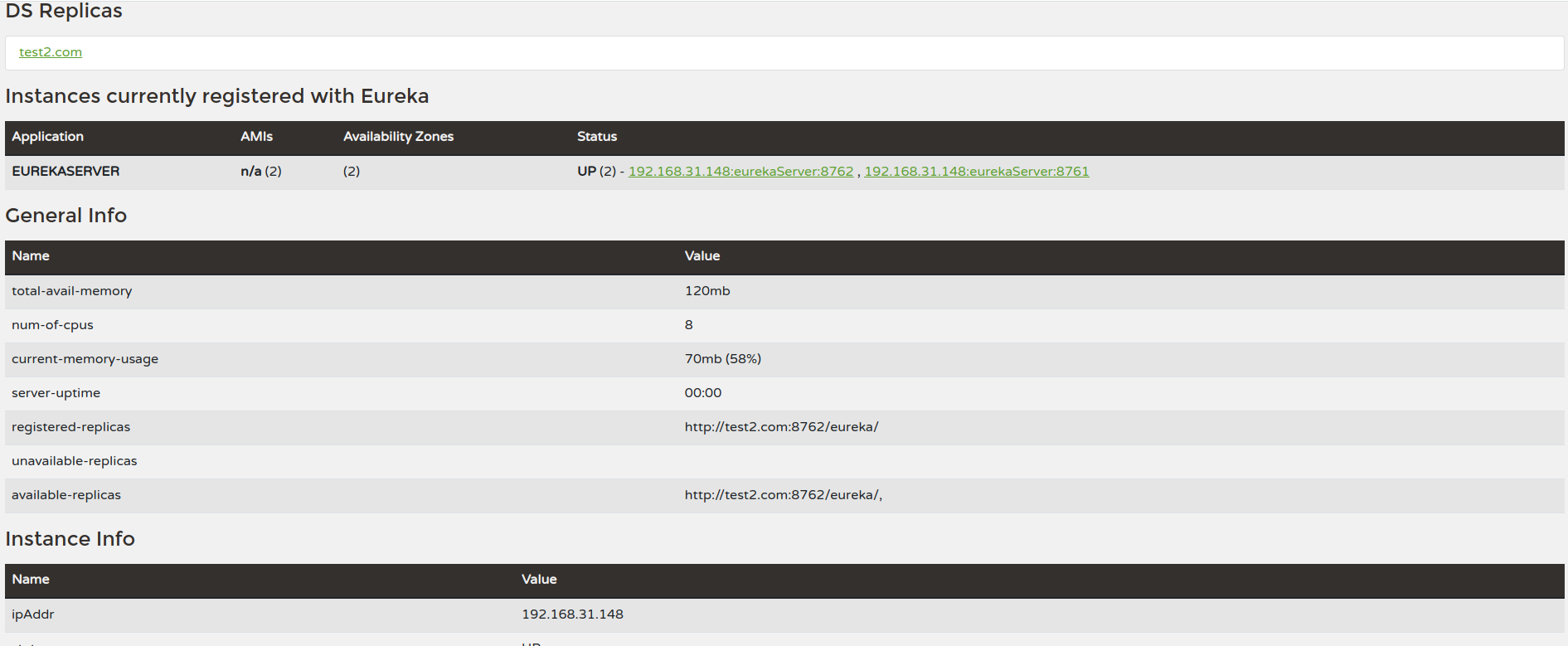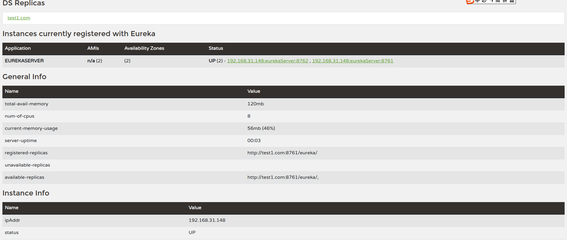 图中Instances currently registered with Eureka有两个服务。General Info下面的registered-replicas和available-replicas为http://test2.com:8762/eureka/。且unavailable-replicas没有内容。
