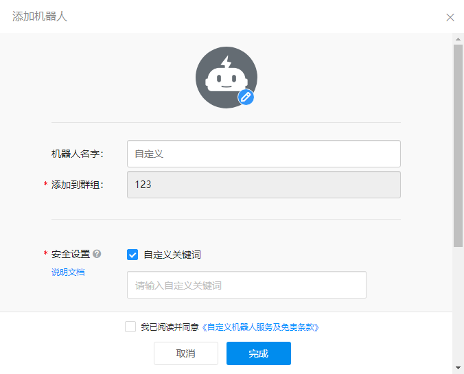 输入机器人名字,选中自定义关键词并输入服务预警。选中同意服务条款。