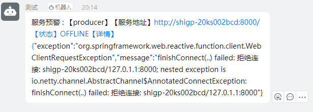 消息体要有服务预警(钉钉机器人的关键词)才能让钉钉群的机器人处理到。