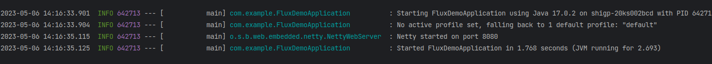 访问http://localhost:8080/flux/hello,看到Flux。查看控制台看到: