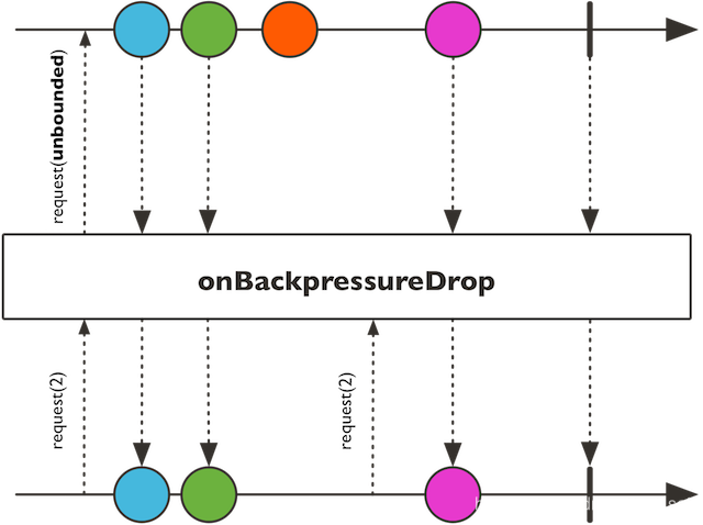 onBackpressureDrop,元素就绪时,根据下游是否有未满足的request来判断是否发出当前元素。