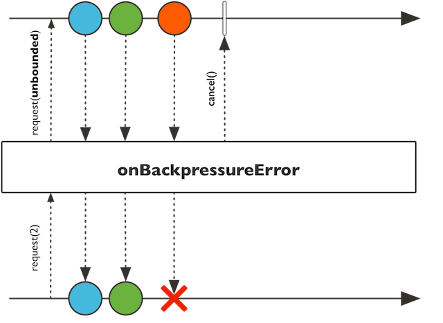 onBackpressureError,当有多余元素就绪时,发出错误信号。