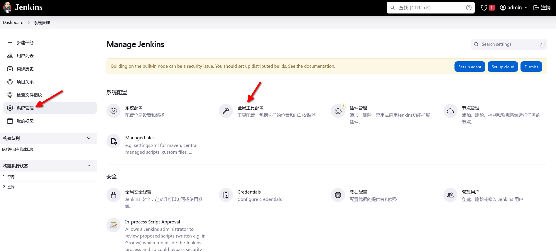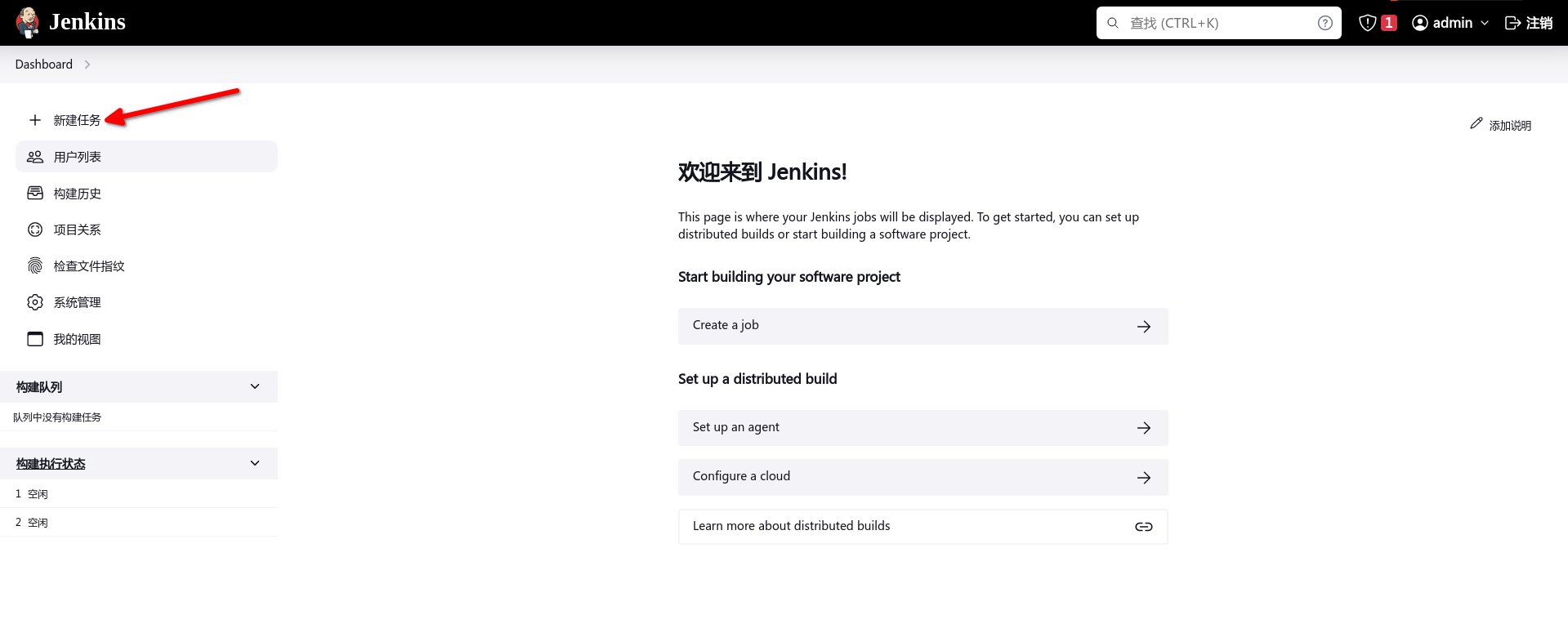 我已经安装了中文插件,第一次访问看到的是英文。根据生成的密码解锁Jenkins,安装推荐插件,之后创建用户,刷新页面,重新登录Jenkins即可。