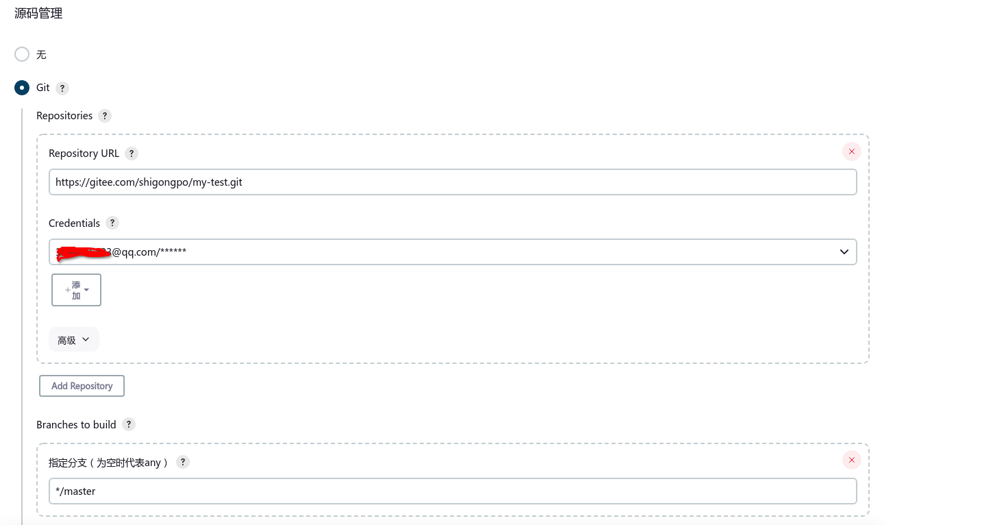 my-test是简单的SpringBoot项目。点击添加 > Jenkins添加gitee的用户名和密码: