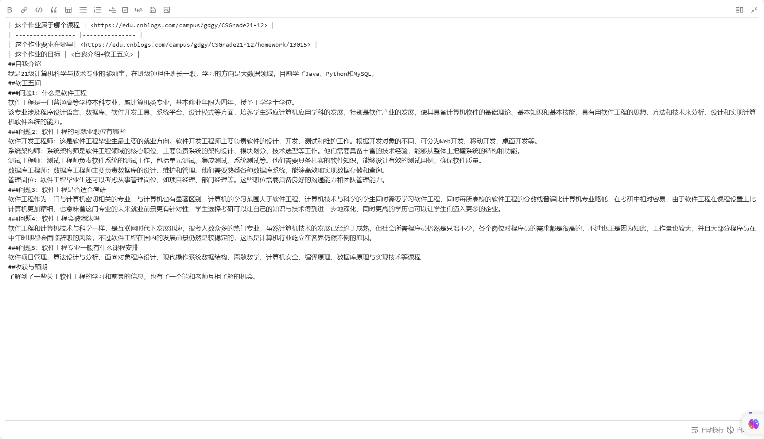 我是21级计算机科学与技术专业的黎灿宇,在班级钟担任班长一职,学习的方向是大数据领域,目前学了Java、Python和MySQL。