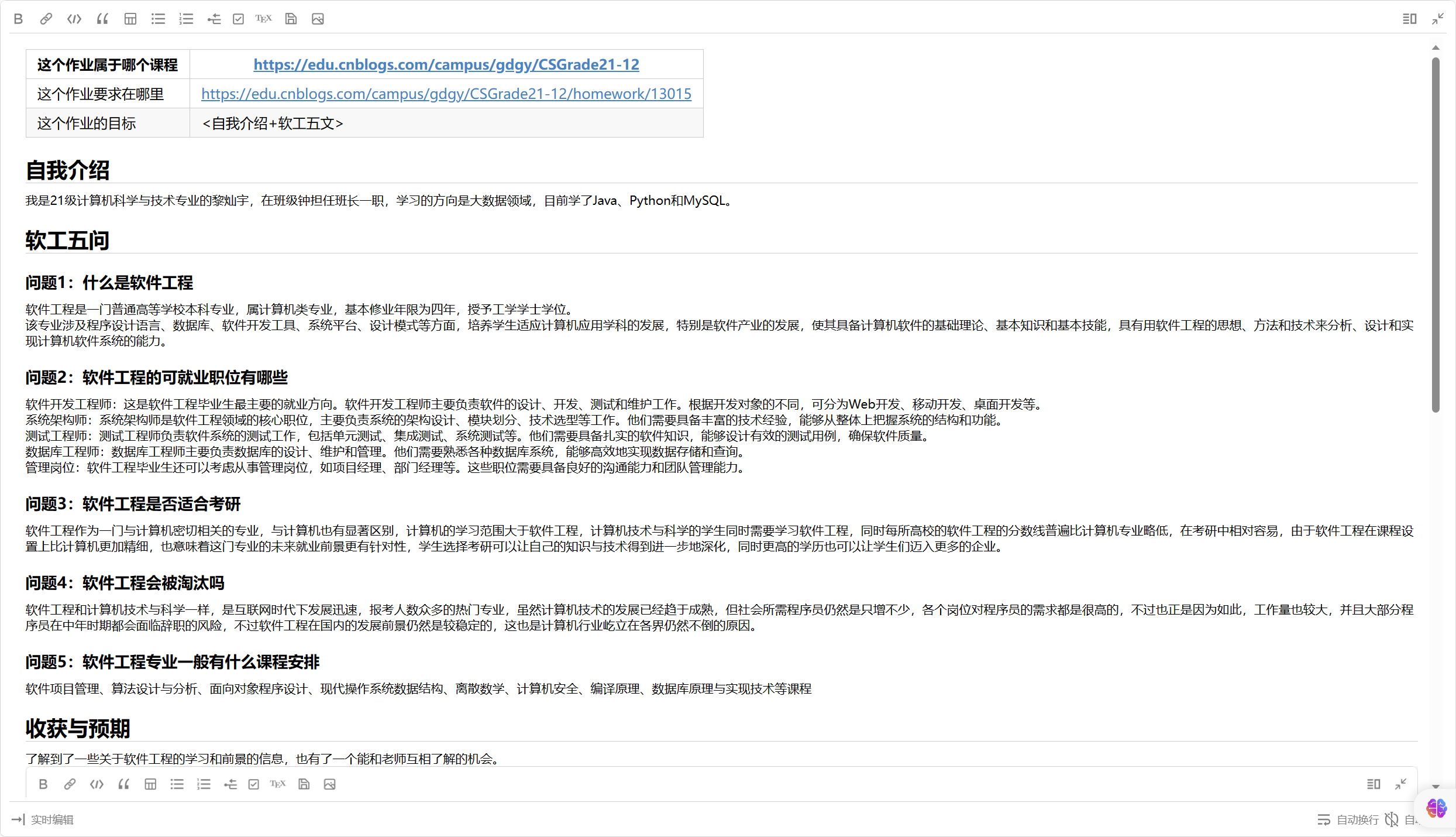 | 这个作业的目标 | <自我介绍+软工五文> |