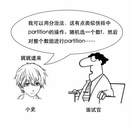 小史:我可以用分治法,这有点类似快排中partition的操作。随机选一个数t,然后对整个数组进行partition,会得到两部分,前一部分的数都大于t,后一部分的数都小于t。