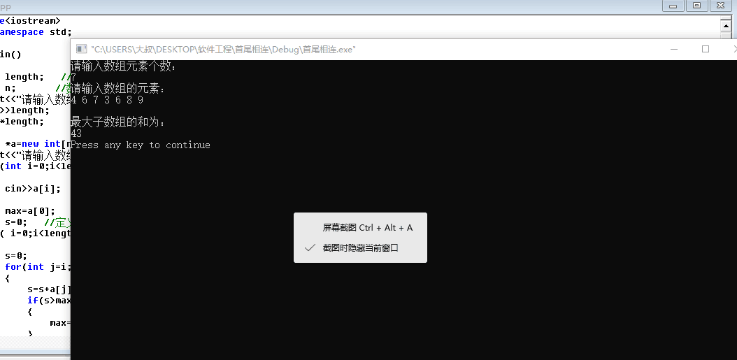 设计思路:随机生成一个数组,然后求其最大子数组,从第一个元素开始排列,然后第二元素排列,依次排列你,因为要求的是首尾相连所以再次以第个元素为首元素循环n个元素形成一个指定数目的数组,然后开始筛选最大子数组。