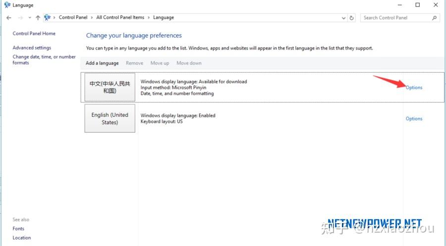 3、找到:中文(中华人民共和国),点击Options,如果当前列表不存在此项,可以点击Add a language先进行添加;