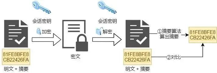 加密成密文后,发送给服务器,服务器解密后,用相同的摘要算法算出发送过来的明文,通过比较客户端携带的「指纹」和当前算出的「指纹」做比较,若「指纹」相同,说明数据是完整的。