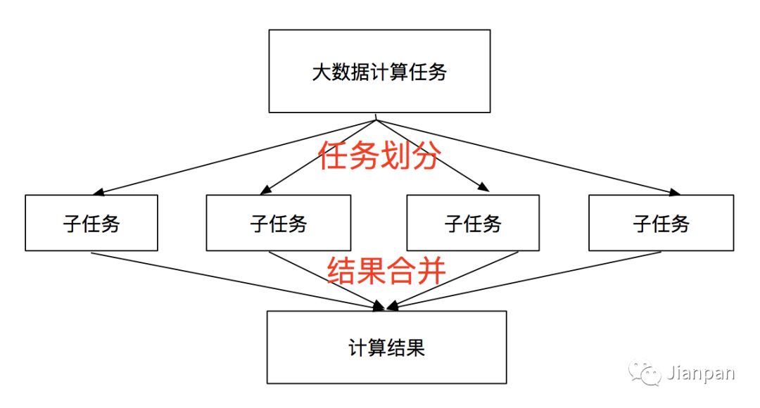 HDFS 解决了大数据存储的问题,那么 MapReduce 自然要解决的是数据计算问题。前面已经说强调了一点,人多力量大啊,同样的道理,在处理大数据计算中,一个台机器是无法满足大批量数据计算的,那怎么办?轮到 MapReduce 闪亮登场了,MapReduce是一种编程模型,用于大规模数据集的并行计算,需要将数据分配到大量的机器上计算,每台机器运行一个子计算任务,最后再合并每台机器运算结果并输出。 MapReduce 的思想就是 『分而治之』