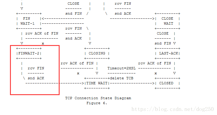 这个图非常权威。我们注意到FINWAIT-2这个状态,它的转移条件只有一个,即收到对端的FIN,然后进入TIMEWAIT。